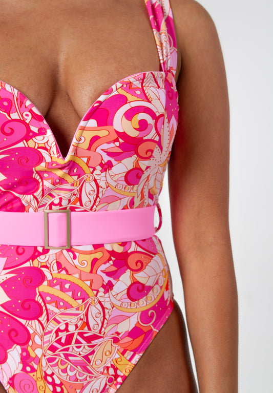 Alessandra Pink Printed Push Up One Piece Swimsuit With Belt